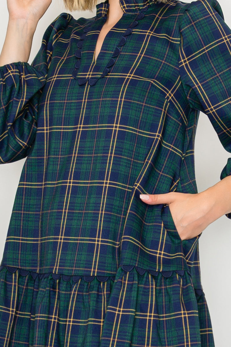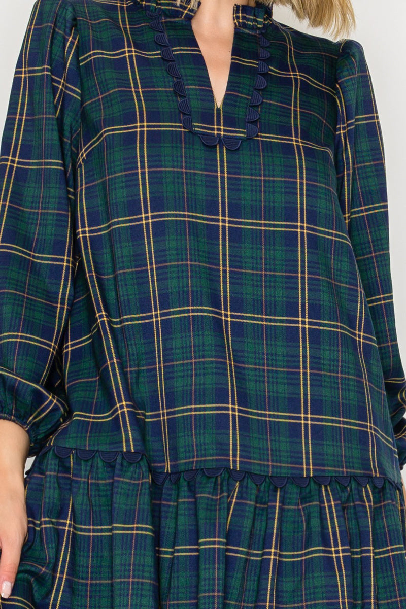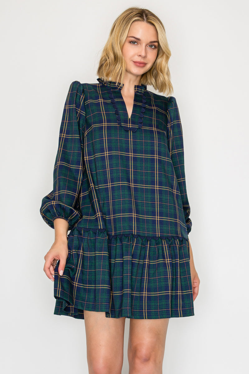 - Classic green & blue tartan choker - Ruffle detail on neck - 3/4 sleeves with elastic cuff - Lace trims detail on neck band and bottom ruffle seam - Side pockets - Full lining - STYLE # - LWD3132 * C.F. LENGTH - 34" SELF - 98% POLYESTER 2% SPANDEX LINING - 100% POLYESTER