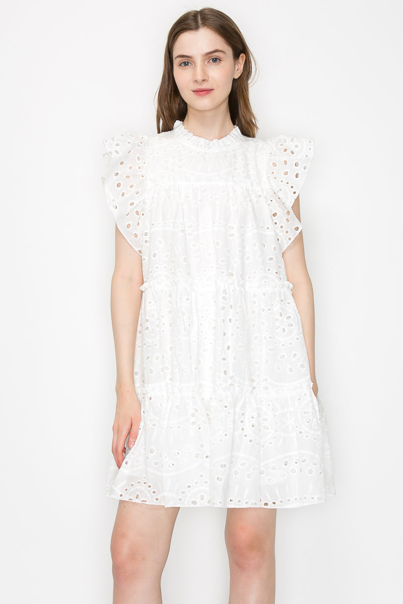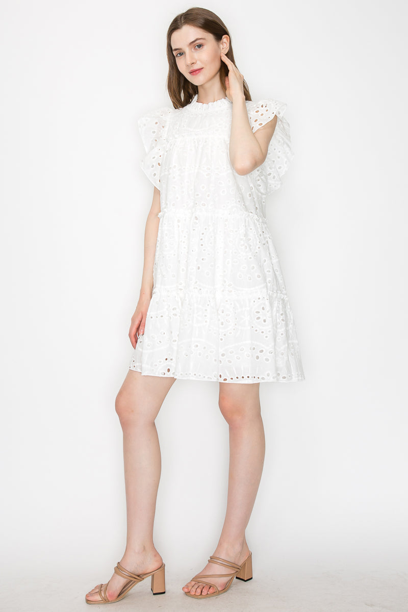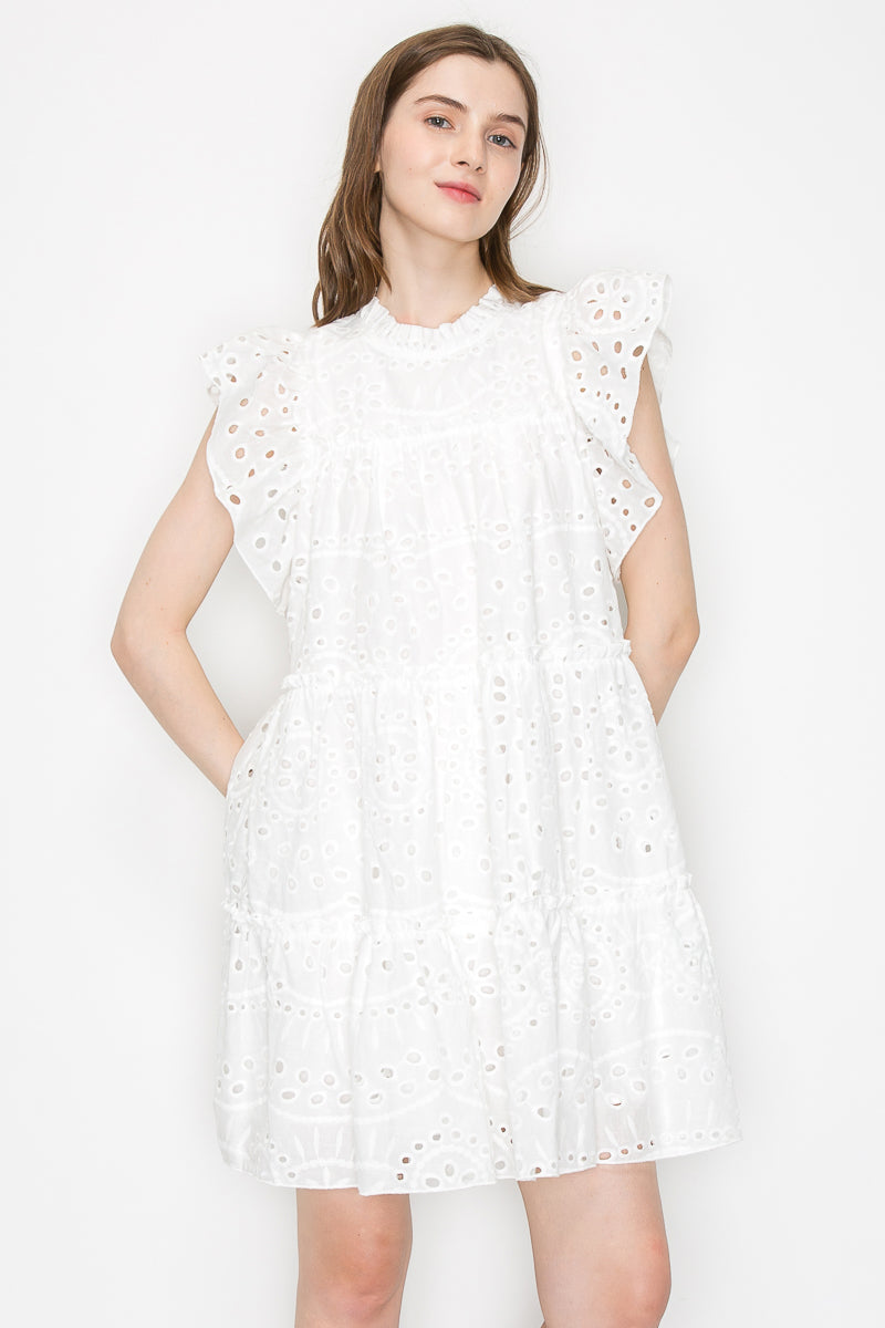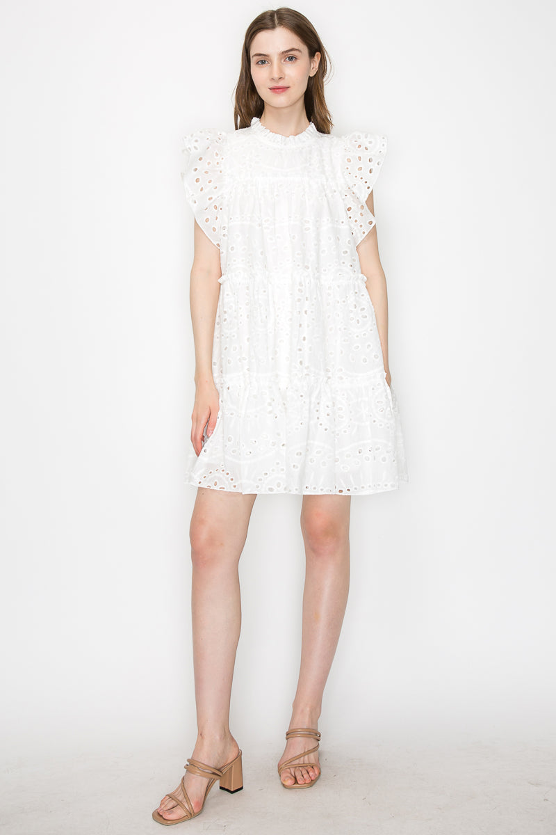 - Feminine and fresh, this white mini dress features intricate eyelet embroidery, fluttery ruffle sleeves, and a romantic high neckline. The tiered silhouette is breezy and flattering—perfect for warm weather, casual outings, or dressed-up daytime looks.