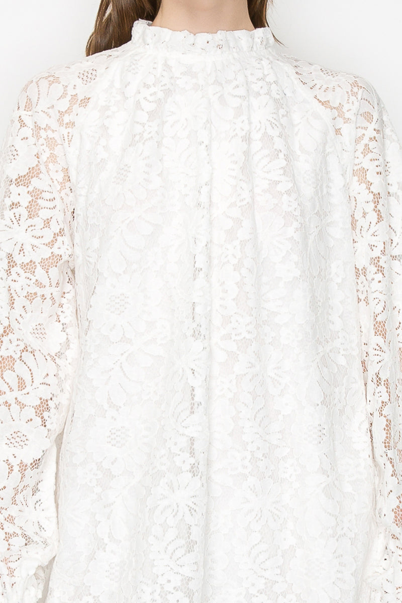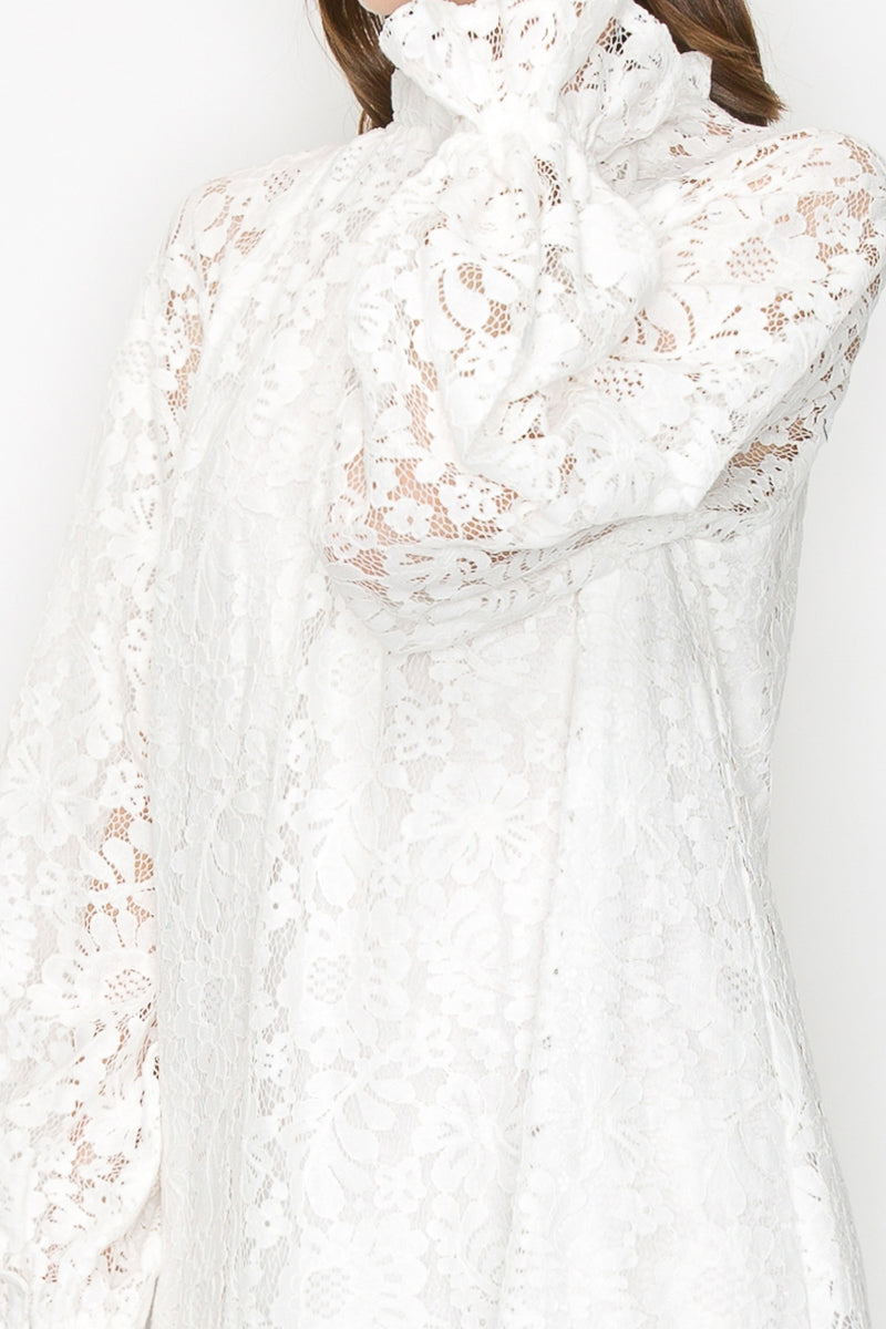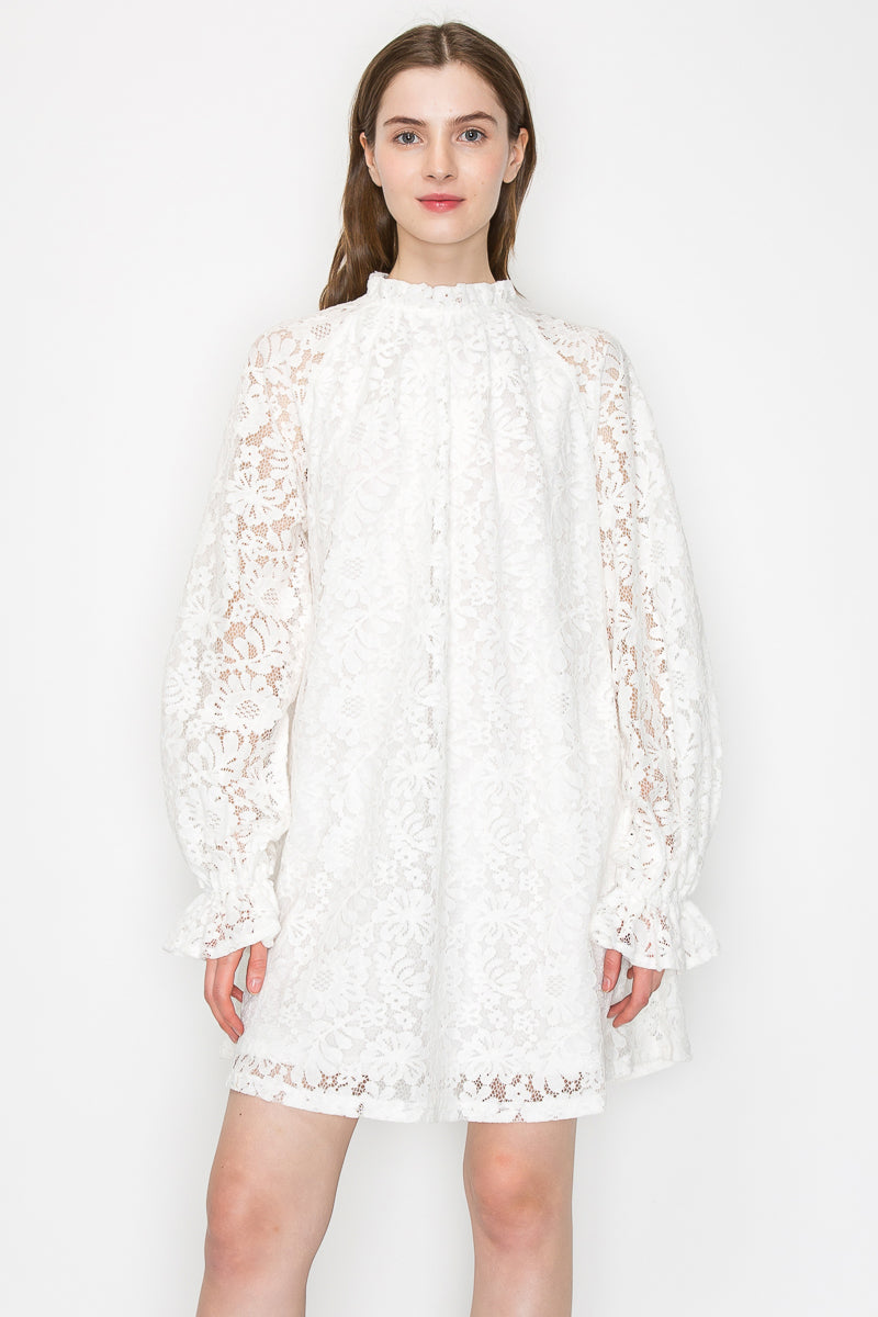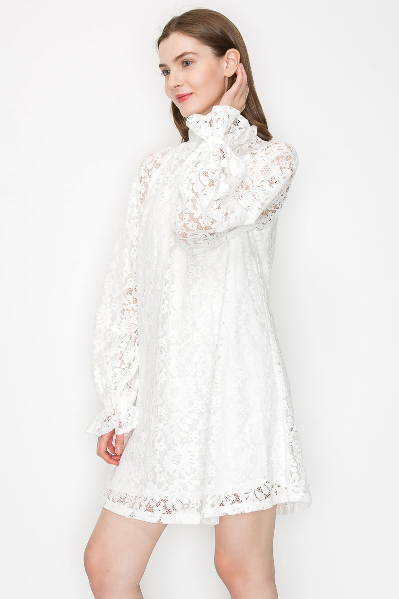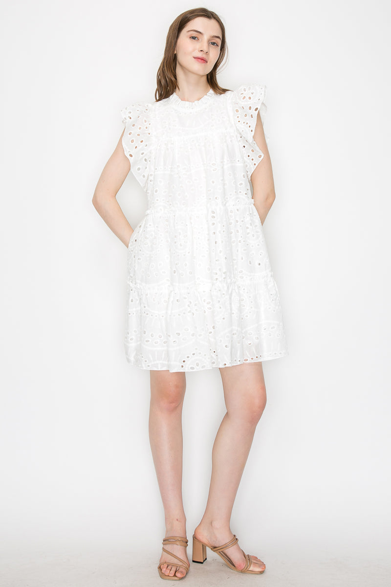 - Feminine and fresh, this white mini dress features intricate eyelet embroidery, fluttery ruffle sleeves, and a romantic high neckline. The tiered silhouette is breezy and flattering—perfect for warm weather, casual outings, or dressed-up daytime looks.